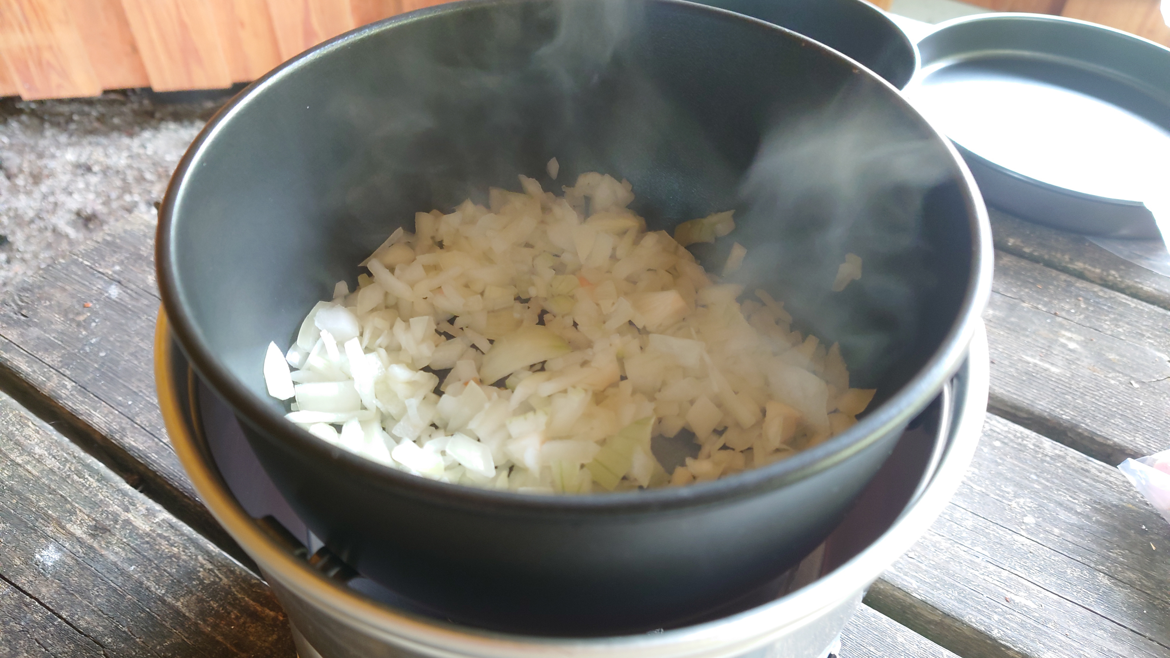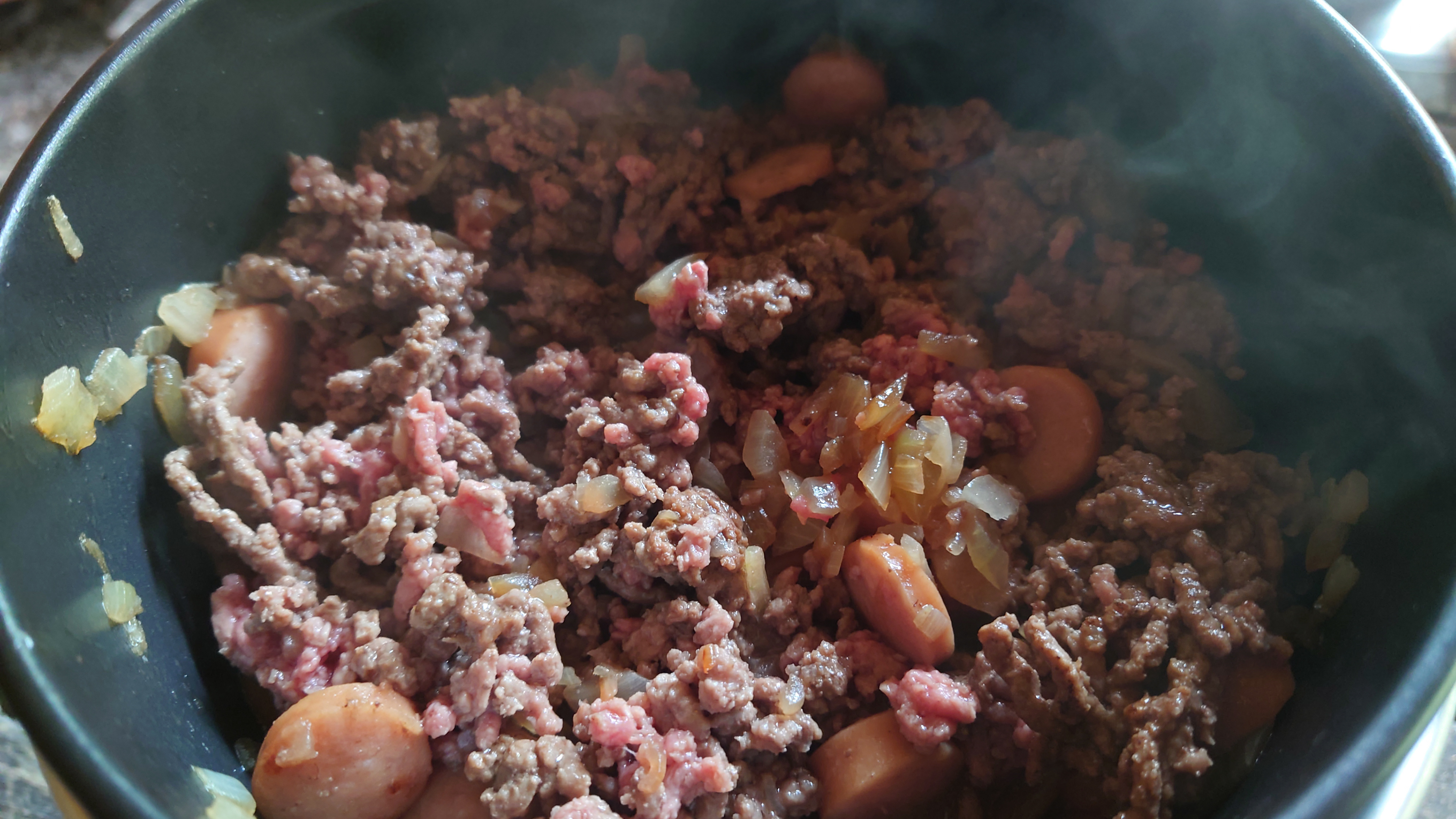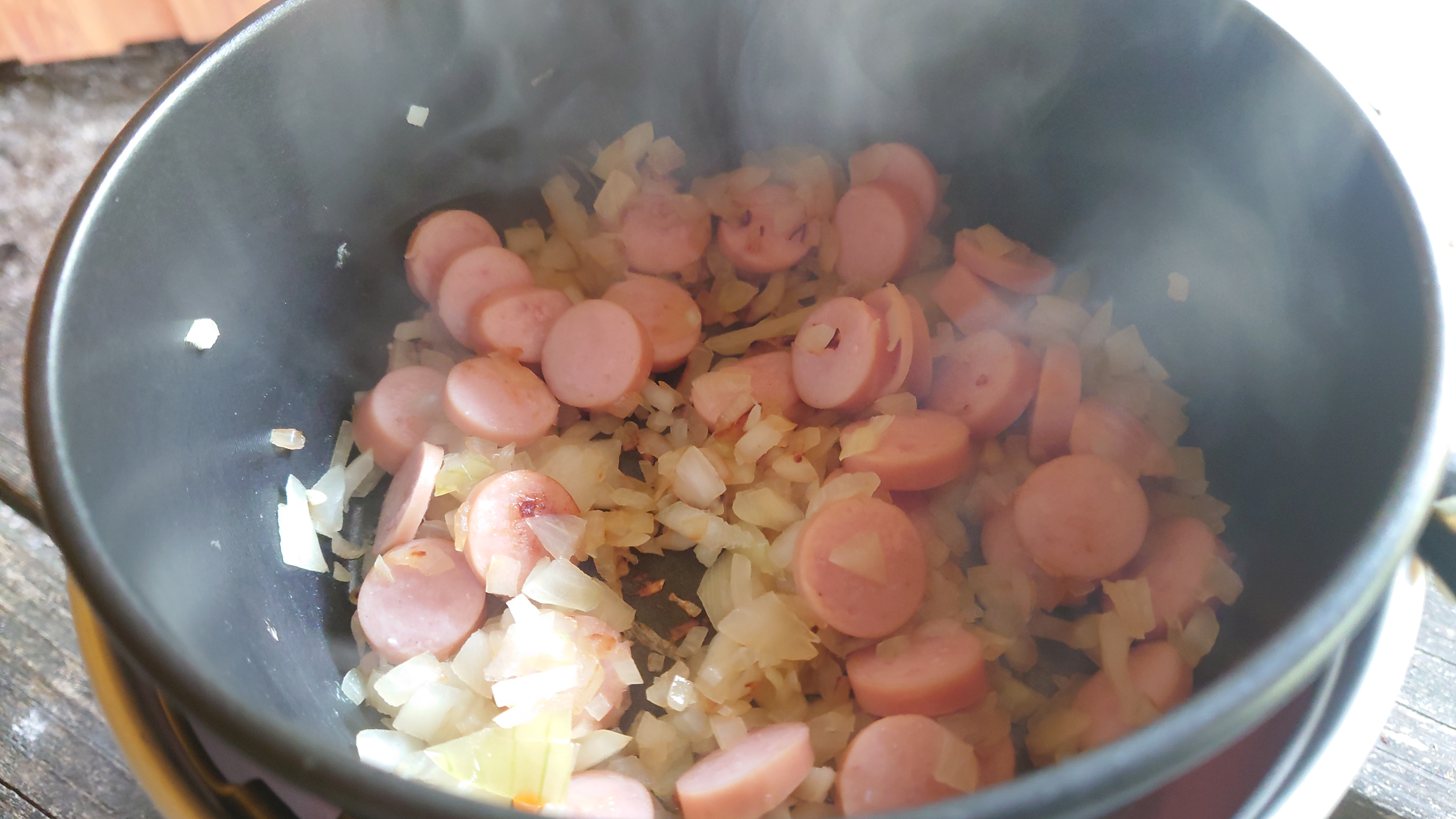 ● Add sausage to the onion and fry them until they have a nice frying crust.