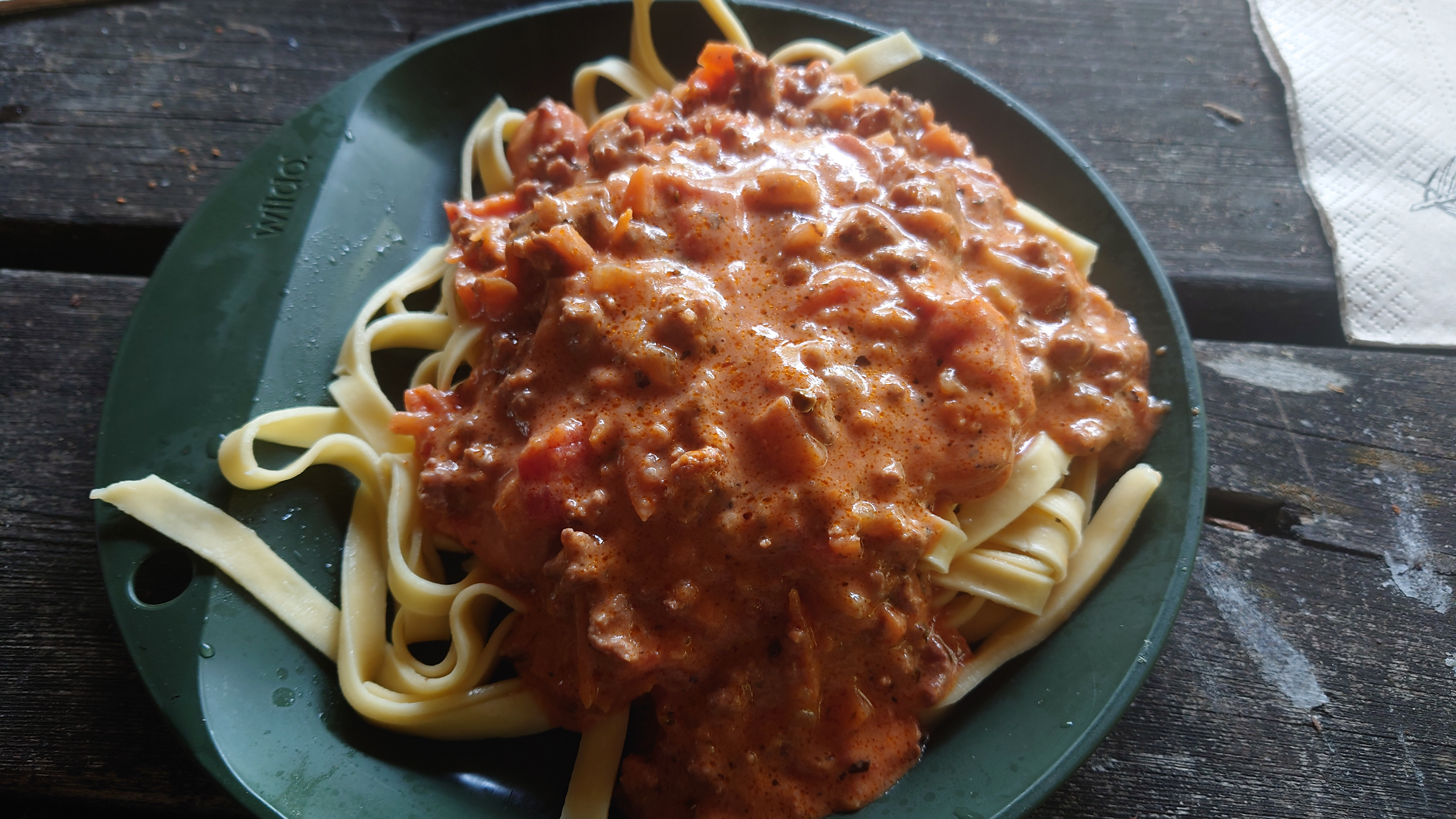 ● When the pasta is done, put some pasta on a plate and pour the bolognese over the pasta.